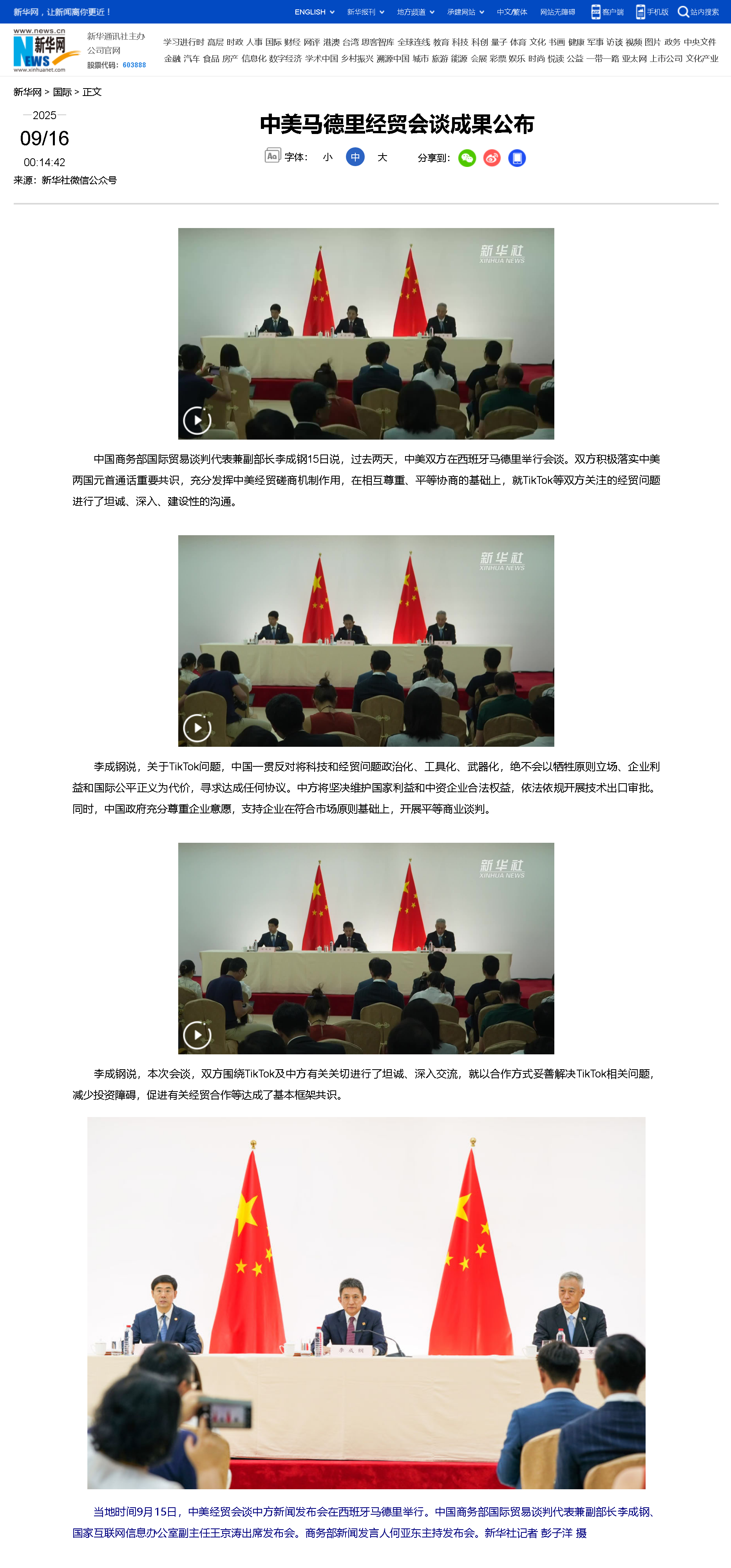 新華社快訊:中國商務(wù)部國際貿(mào)易談判代表兼副部長李成鋼15日說,過去兩天,中美雙方在西班牙馬德里舉行會談。雙方積極落實中美兩國元首通話重要共識,充分發(fā)揮中美經(jīng)貿(mào)磋商機制作用,在相互尊重、平等協(xié)商的基礎(chǔ)上,就TikTok等雙方關(guān)注的經(jīng)貿(mào)問題進行了坦誠、深入、建設(shè)性的溝通。