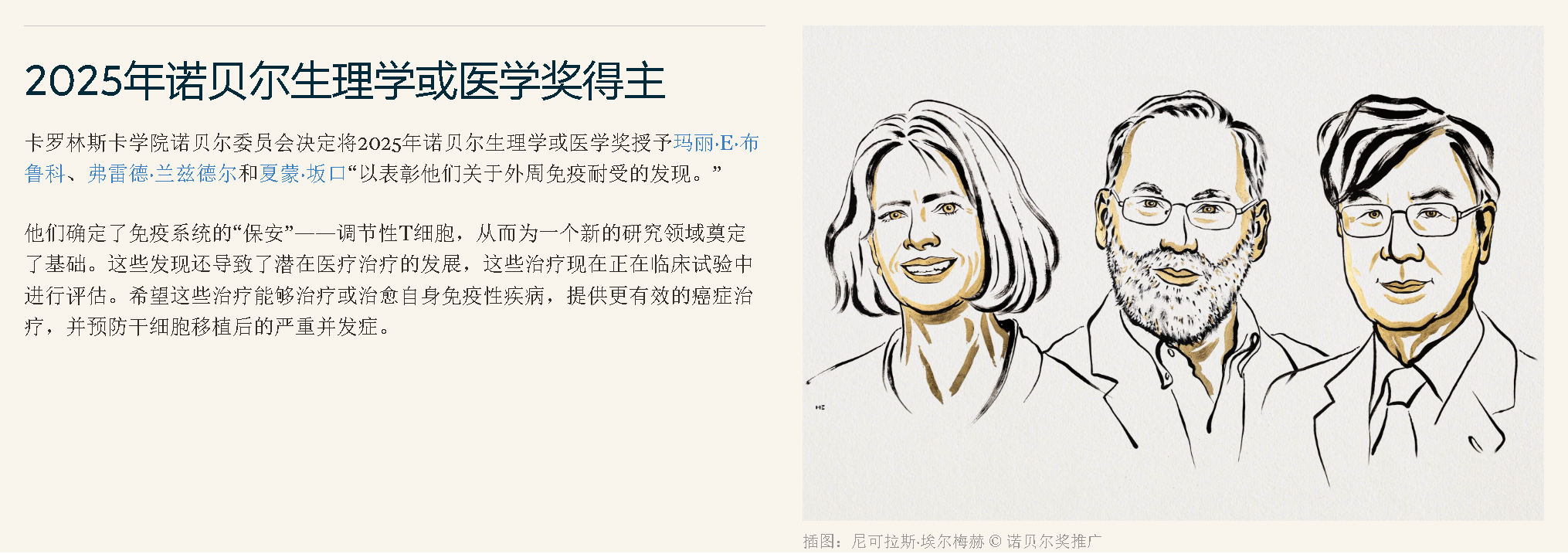 新華社斯德哥爾摩10月6日電(記者郭爽 張兆卿)瑞典卡羅琳醫(yī)學(xué)院6日宣布,將2025年諾貝爾生理學(xué)或醫(yī)學(xué)獎授予美國科學(xué)家瑪麗·布倫科、弗雷德·拉姆斯德爾和日本科學(xué)家坂口志文,以表彰他們在外周免疫耐受機制方面的開創(chuàng)性發(fā)現(xiàn)。