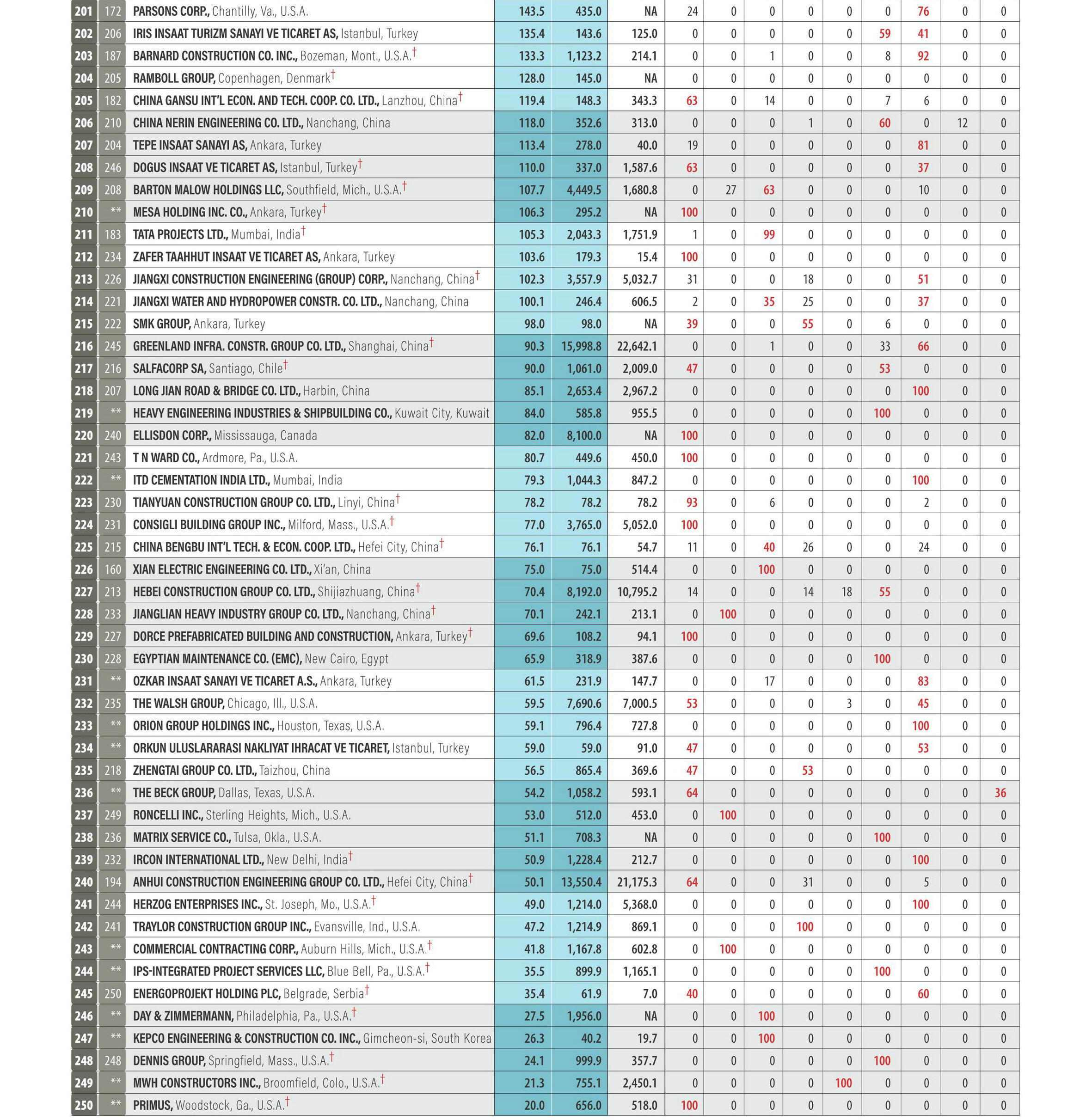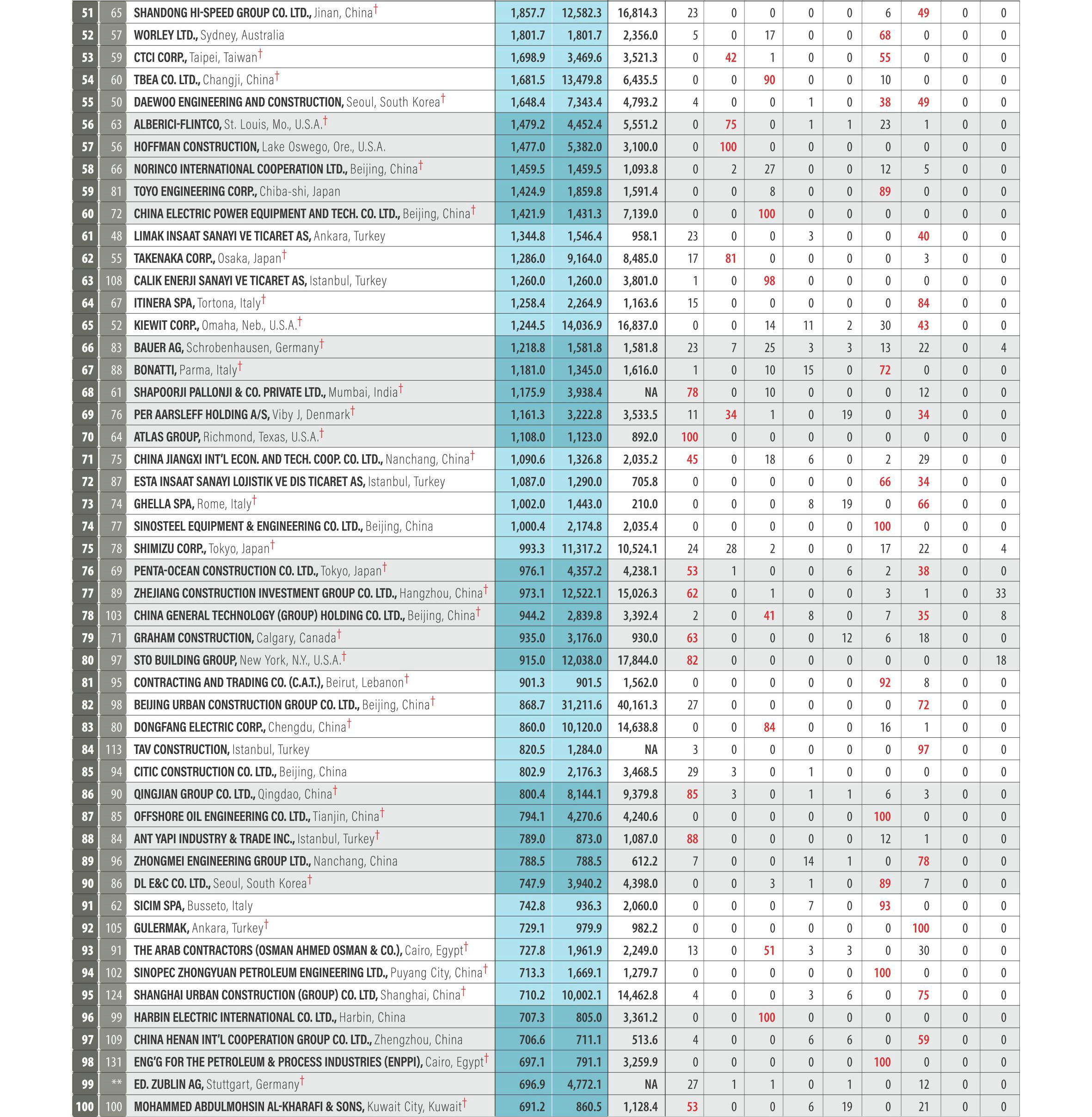 在ENR同期發(fā)布的“最大250家全球承包商”榜單中(以國內(nèi)與國際營業(yè)額合計(jì)排序),共7家中國企業(yè)進(jìn)入前10強(qiáng),與上年度持平,其中中國建筑、中國中鐵、中國鐵建、中國交建包攬前4位,中國電建排名第6位、中冶科工排名第7位、上海建工排名第8位。此外,中國能建、北京城建、山西建投、中國化學(xué)工程、陜西建工、湖南建投、北京建工、綠地大基建、中國核建、安徽建工、特變電工、中油工程、山東高速、浙江建投、四川路橋、東方電氣、上海城建等企業(yè)進(jìn)入榜單前50強(qiáng),體現(xiàn)了中國企業(yè)在全球基建行業(yè)的重要地位。