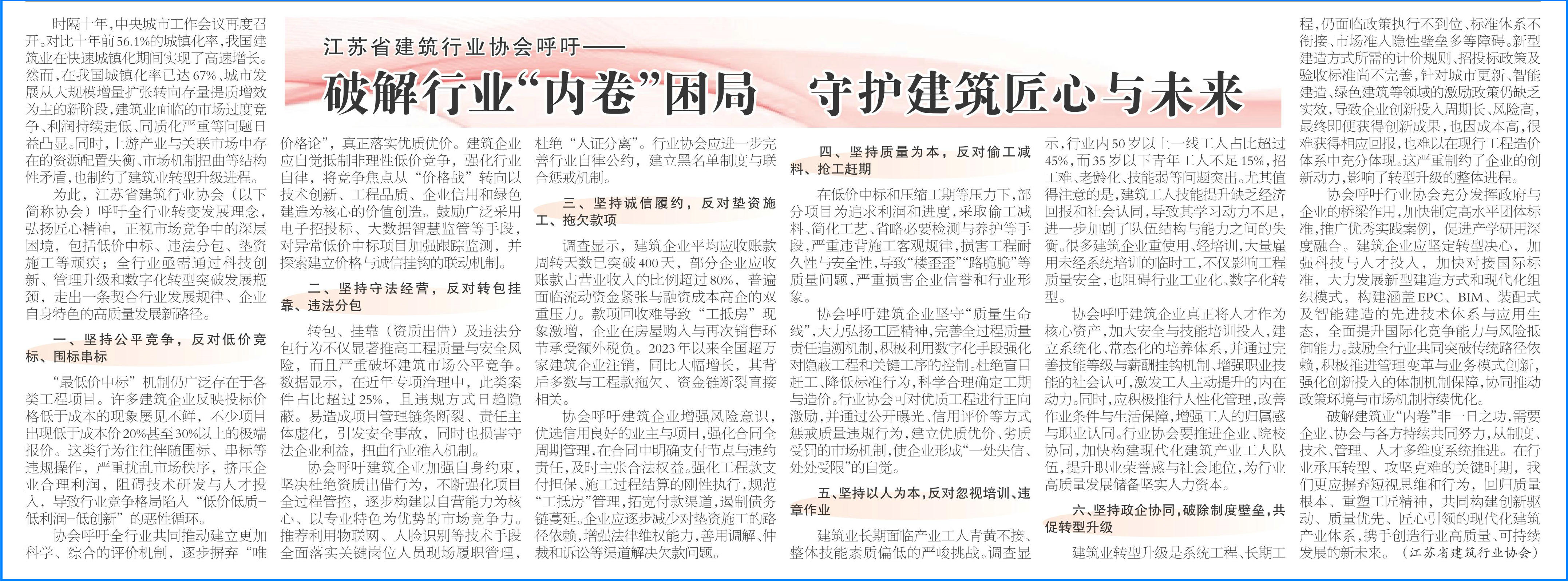 為此,江蘇省建筑行業(yè)協(xié)會(huì)(以下簡稱協(xié)會(huì))呼吁全行業(yè)轉(zhuǎn)變發(fā)展理念,弘揚(yáng)匠心精神,正視市場競爭中的深層困境,包括低價(jià)中標(biāo)、違法分包、墊資施工等頑疾;全行業(yè)亟需通過科技創(chuàng)新、管理升級(jí)和數(shù)字化轉(zhuǎn)型突破發(fā)展瓶頸,走出一條契合行業(yè)發(fā)展規(guī)律、企業(yè)自身特色的高質(zhì)量發(fā)展新路徑。
