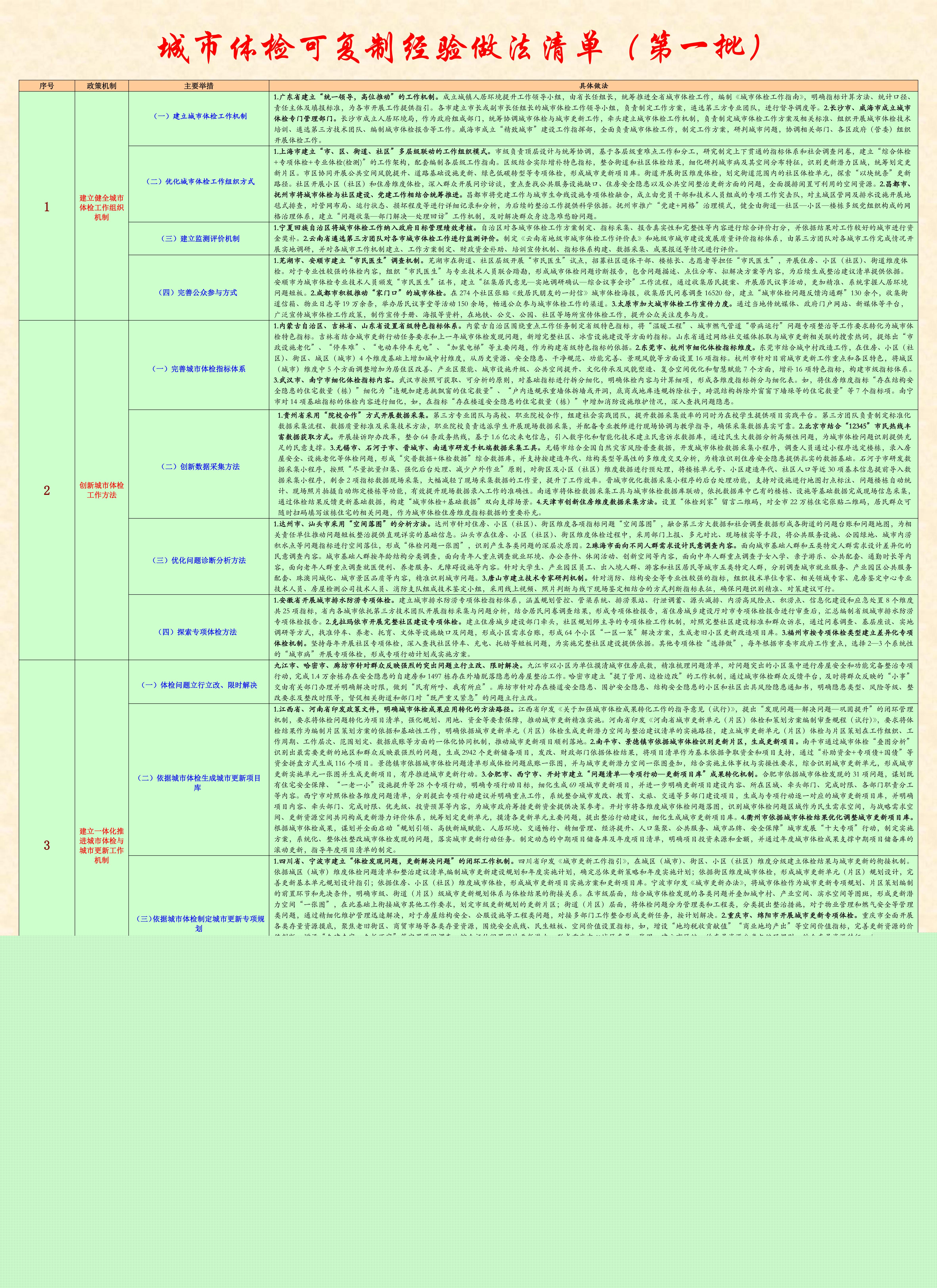 為貫徹落實(shí)中央城市工作會議精神和《中共中央、國務(wù)院關(guān)于推動城市高質(zhì)量發(fā)展的意見》《中共中央辦公廳、國務(wù)院辦公廳關(guān)于持續(xù)推進(jìn)城市更新行動的意見》部署要求,深入推進(jìn)城市體檢工作,住房城鄉(xiāng)建設(shè)部總結(jié)各地在建立健全城市體檢工作組織機(jī)制、創(chuàng)新城市體檢工作方法、建立一體化推進(jìn)城市體檢與城市更新工作機(jī)制、加強(qiáng)城市體檢工作保障等方面的經(jīng)驗(yàn)做法,形成《城市體檢可復(fù)制經(jīng)驗(yàn)做法清單(第一批)》(以下簡稱《清單》)并于近日發(fā)布。