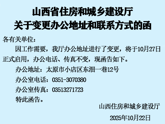 【行業(yè)動態(tài)】山西省住房和城鄉(xiāng)建設(shè)廳關(guān)于變更辦公地址和聯(lián)系方式的函