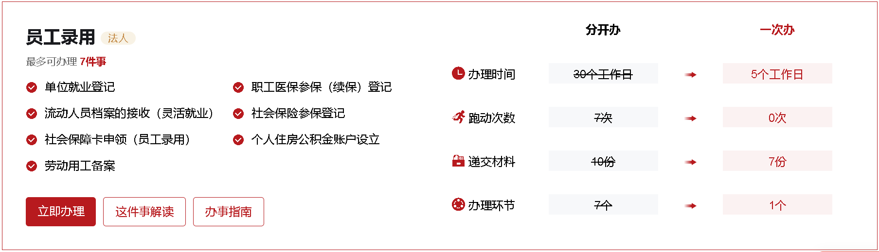 據(jù)悉,此次上線的“員工錄用一件事”服務(wù)對象覆蓋山西范圍內(nèi)所有用人企業(yè),整合人社部門負(fù)責(zé)的單位就業(yè)登記、社會保險參保登記、社會保障卡申領(lǐng)、流動人員檔案接收(員工錄用)、勞動用工備案,醫(yī)保部門負(fù)責(zé)的職工醫(yī)療保險參保(續(xù)保)登記,以及住建部門負(fù)責(zé)的個人住房公積金賬戶設(shè)立在內(nèi)的7項高頻關(guān)聯(lián)事項。以往企業(yè)需分別對接多個部門、跑7次窗口、歷經(jīng)30個工作日才能辦結(jié)的業(yè)務(wù),如今辦理環(huán)節(jié)壓縮至1個,在材料齊全、符合受理條件的情況下,最快1個工作日即可辦結(jié),最長不超過5個工作日,且全程不收取任何費用。