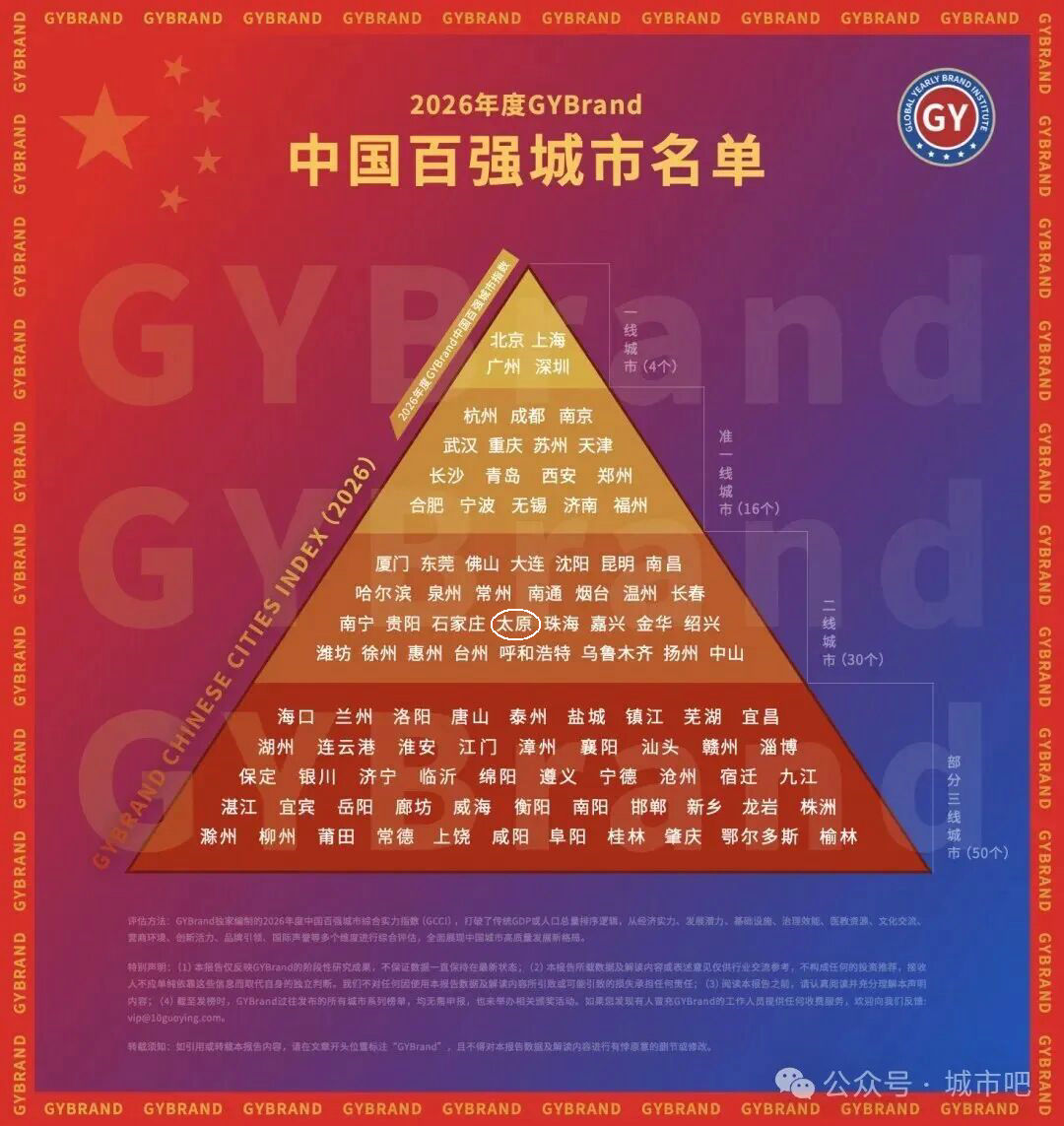 3月5日,GYBrand全球品牌研究院發(fā)布2026年度中國(guó)百?gòu)?qiáng)城市指數(shù)榜單,太原市位于第38位,相比上年位次提升兩位,仍處于二線城市梯隊(duì)。