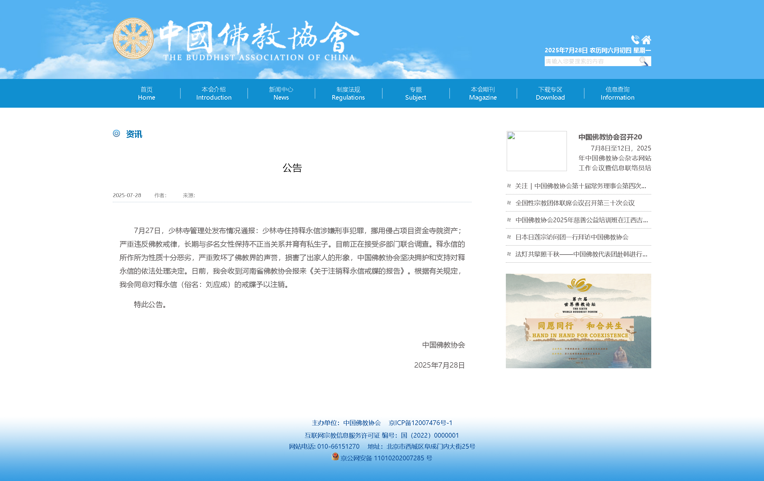 7月27日,少林寺管理處發(fā)布情況通報(bào):少林寺住持釋永信涉嫌刑事犯罪,挪用侵占項(xiàng)目資金寺院資產(chǎn);嚴(yán)重違反佛教戒律,長(zhǎng)期與多名女性保持不正當(dāng)關(guān)系并育有私生子。目前正在接受多部門(mén)聯(lián)合調(diào)查。釋永信的所作所為性質(zhì)十分惡劣,嚴(yán)重?cái)牧朔鸾探绲穆曌u(yù),損害了出家人的形象,中國(guó)佛教協(xié)會(huì)堅(jiān)決擁護(hù)和支持對(duì)釋永信的依法處理決定。日前,我會(huì)收到河南省佛教協(xié)會(huì)報(bào)來(lái)《關(guān)于注銷釋永信戒牒的報(bào)告》。根據(jù)有關(guān)規(guī)定,我會(huì)同意對(duì)釋永信(俗名:劉應(yīng)成)的戒牒予以注銷。