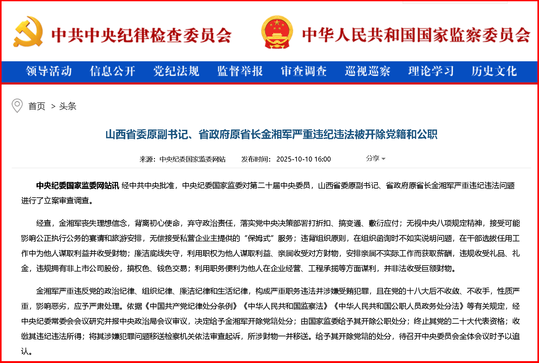 金湘軍嚴(yán)重違反黨的政治紀(jì)律、組織紀(jì)律、廉潔紀(jì)律和生活紀(jì)律,構(gòu)成嚴(yán)重職務(wù)違法并涉嫌受賄犯罪,且在黨的十八大后不收斂、不收手,性質(zhì)嚴(yán)重,影響惡劣,應(yīng)予嚴(yán)肅處理。依據(jù)《中國(guó)共產(chǎn)黨紀(jì)律處分條例》《中華人民共和國(guó)監(jiān)察法》《中華人民共和國(guó)公職人員政務(wù)處分法》等有關(guān)規(guī)定,經(jīng)中央紀(jì)委常委會(huì)會(huì)議研究并報(bào)中央政治局會(huì)議審議,決定給予金湘軍開除黨籍處分;由國(guó)家監(jiān)委給予其開除公職處分;終止其黨的二十大代表資格;收繳其違紀(jì)違法所得;將其涉嫌犯罪問(wèn)題移送檢察機(jī)關(guān)依法審查起訴,所涉財(cái)物一并移送。給予其開除黨籍的處分,待召開中央委員會(huì)全體會(huì)議時(shí)予以追認(rèn)。