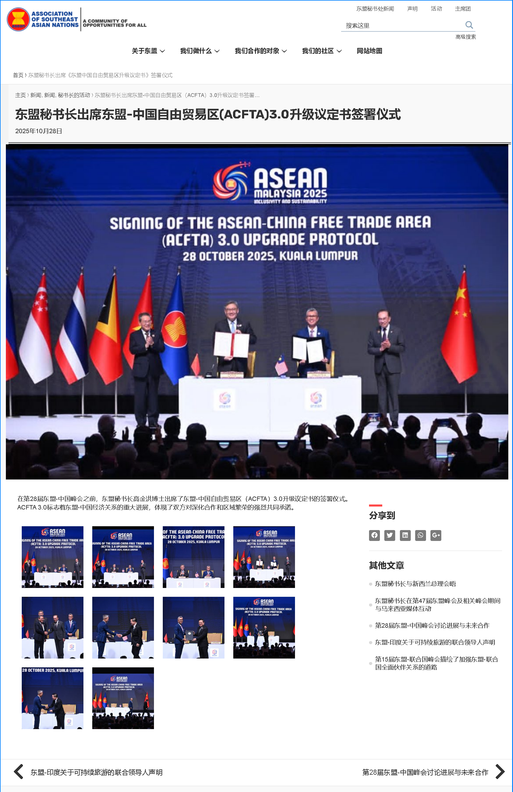 此后,雙方按照領(lǐng)導(dǎo)人指示,加緊開展個(gè)別剩余條款技術(shù)磋商及議定書文本法律審核等后續(xù)工作。經(jīng)過4次特別聯(lián)委會(huì)及多輪工作組磋商,雙方于2025年5月全面完成3.0版談判。2025年10月28日,雙方在馬來西亞吉隆坡召開的第28次中國—東盟領(lǐng)導(dǎo)人會(huì)議期間,正式簽署3.0版升級(jí)議定書。