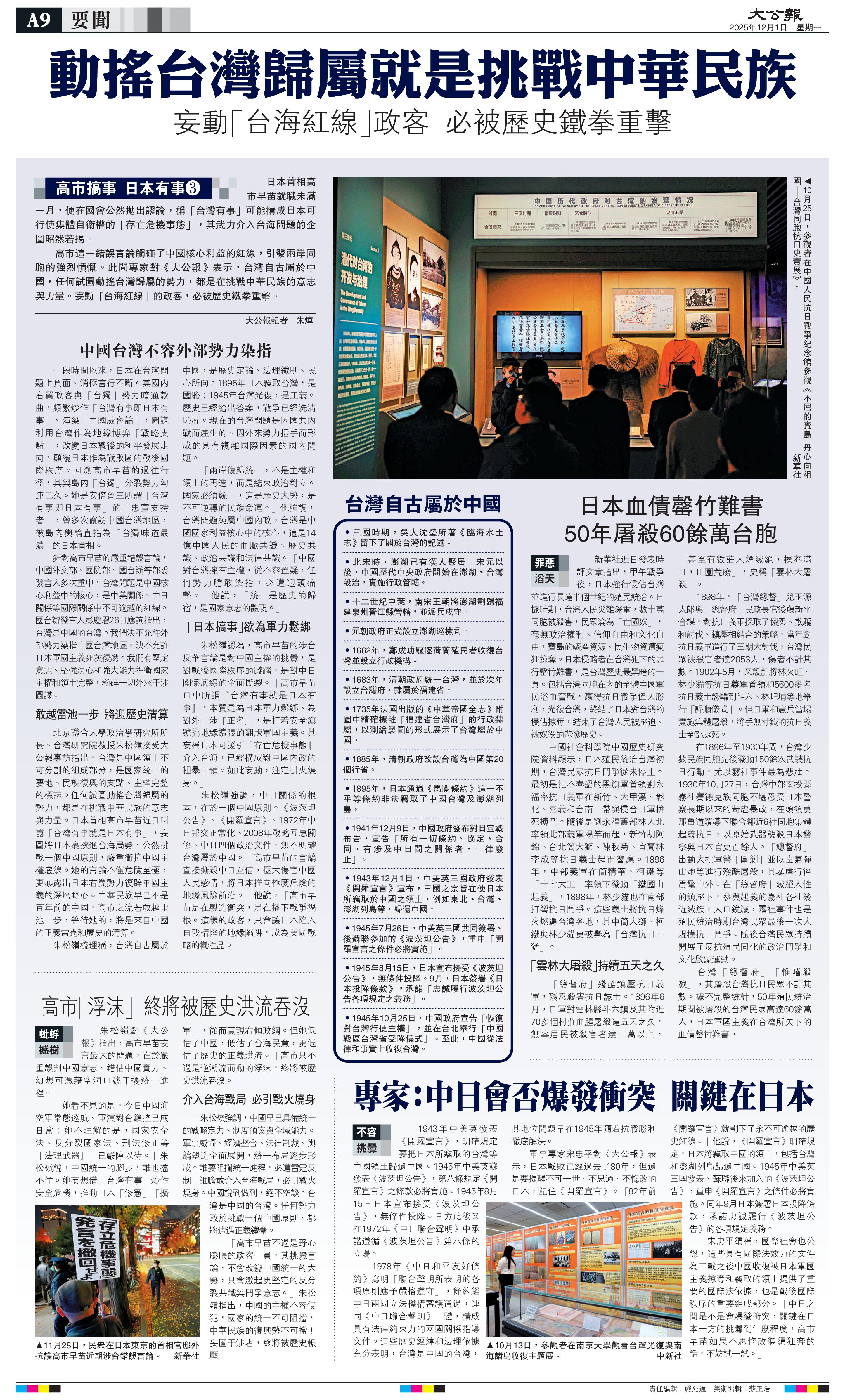 日方避而不談的,恐怕不僅僅是在臺灣問題上的立場。今天是《開羅宣言》發(fā)表82周年?!堕_羅宣言》等一系列國際法律文件不僅明確了中國對臺灣的主權,更是世界反法西斯戰(zhàn)爭的重大成果,構成戰(zhàn)后國際秩序的重要組成部分。遵守其有關規(guī)定是日方必須承擔的國際法義務,也是戰(zhàn)后日本重獲國際社會接納的前提?,F(xiàn)在日方只字不提具有充分國際法效力的上述文件,卻一味引用一個把受日本殖民侵略最嚴重的亞洲鄰國特別是中國排斥在外的文件,這是對日本軍國主義侵略慘痛記憶的漠視,對世界反法西斯戰(zhàn)爭歷史真相的褻瀆,對聯(lián)合國權威和戰(zhàn)后國際秩序的公然挑戰(zhàn)。日方近年來大幅調整安保政策,逐年增加防衛(wèi)預算,圖謀修改“無核三原則”。日本某些勢力正極力突破“和平憲法”束縛,企圖違背國際法規(guī)定的戰(zhàn)敗國義務。這些人從未真正汲取歷史教訓,從未真正直面和反思日本在戰(zhàn)爭中犯下的滔天罪責,從未真正遏止軍國主義在日本死灰復燃,反而企圖用美化侵略的敘事和“避而不談”的手法,讓世人遺忘,為自己“松綁”。這種伎倆欺騙不了世人。