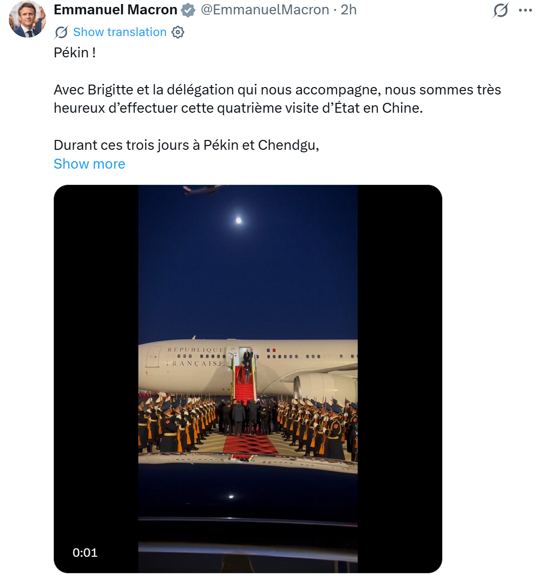 馬克龍表示,在北京和成都的這三天里,法方將與中方討論世界迫切需要的和平與經(jīng)濟(jì)議題。他將與中國(guó)及所有伙伴攜手應(yīng)對(duì)重大挑戰(zhàn),并堅(jiān)信能有所作為。