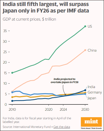 印度知名財經(jīng)媒體MINT則發(fā)文指出,盡管蘇布拉馬尼亞姆用IMF的數(shù)據(jù)加以佐證,但事實并非如此。根據(jù)IMF今年4月發(fā)布的《世界經(jīng)濟展望》報告顯示,印度2025財年的GDP預計將達到3.909萬億美元,而日本2024日歷年的GDP預計為4.026萬億美元。因此,印度目前仍是世界第五大經(jīng)濟體。