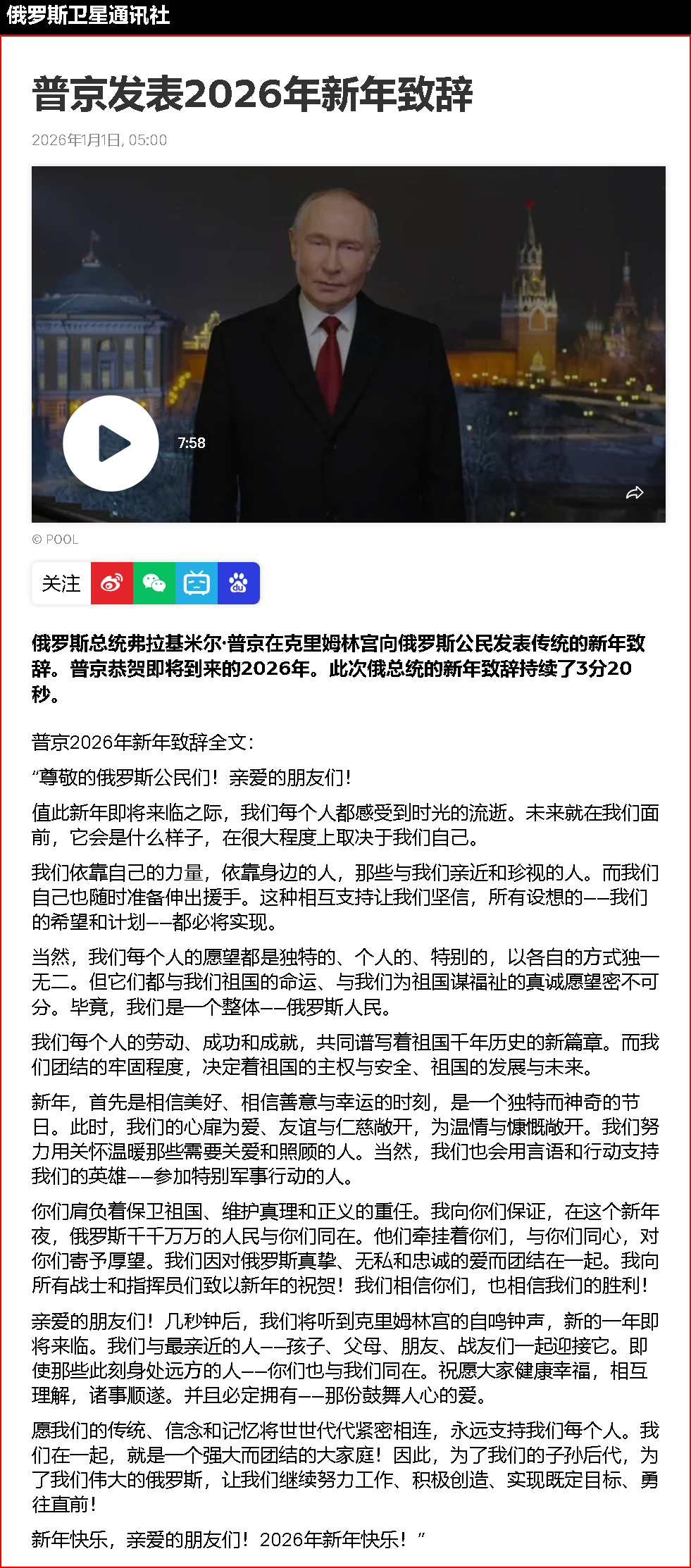 新華社莫斯科12月31日電 俄羅斯總統(tǒng)普京12月31日向俄民眾發(fā)表新年賀詞時,向參加對烏克蘭特別軍事行動的俄羅斯軍人表達(dá)支持,并說“相信我們終將勝利”。
