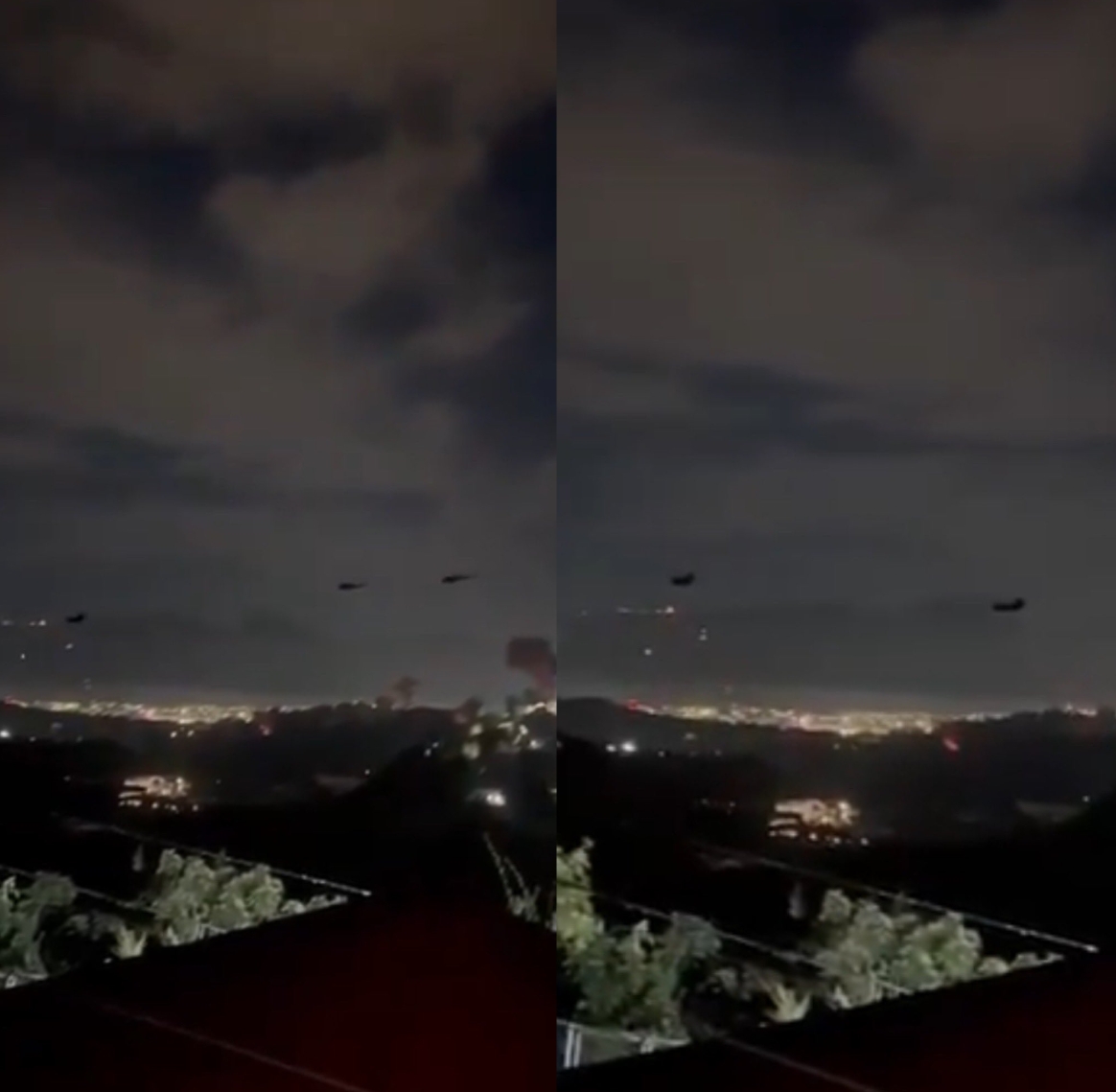 社交媒體上,拍攝于當(dāng)?shù)氐囊曨l顯示,數(shù)十架疑似美軍直升機(jī)盤旋于加拉加斯上空。