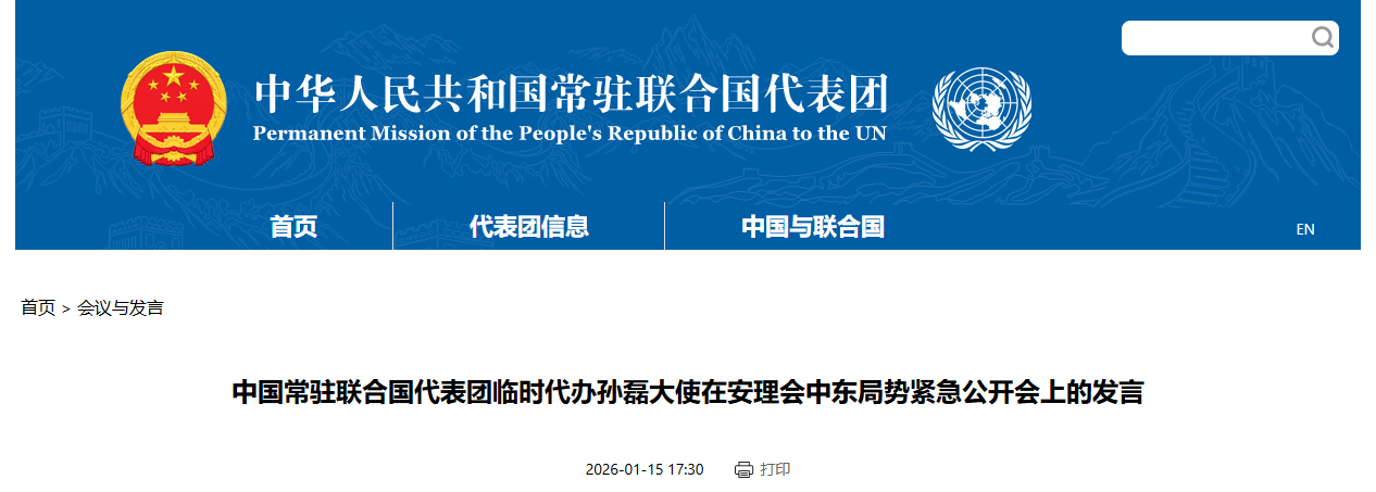 據(jù)中國常駐聯(lián)合國代表團(tuán)網(wǎng)站消息,當(dāng)?shù)貢r間1月15日,聯(lián)合國安理會就中東局勢舉行緊急公開會,中國常駐聯(lián)合國代表團(tuán)臨時代辦孫磊大使在會上的發(fā)言中指出,中方支持維護(hù)伊朗主權(quán)、安全和領(lǐng)土完整,呼吁國際社會支持伊朗政府和人民克服當(dāng)前困難,維持國家安全和社會穩(wěn)定。呼吁美方恪守聯(lián)合國憲章宗旨和原則,放下武力執(zhí)念,各方保持克制,共同為維護(hù)世界和平與安全發(fā)揮應(yīng)有作用。