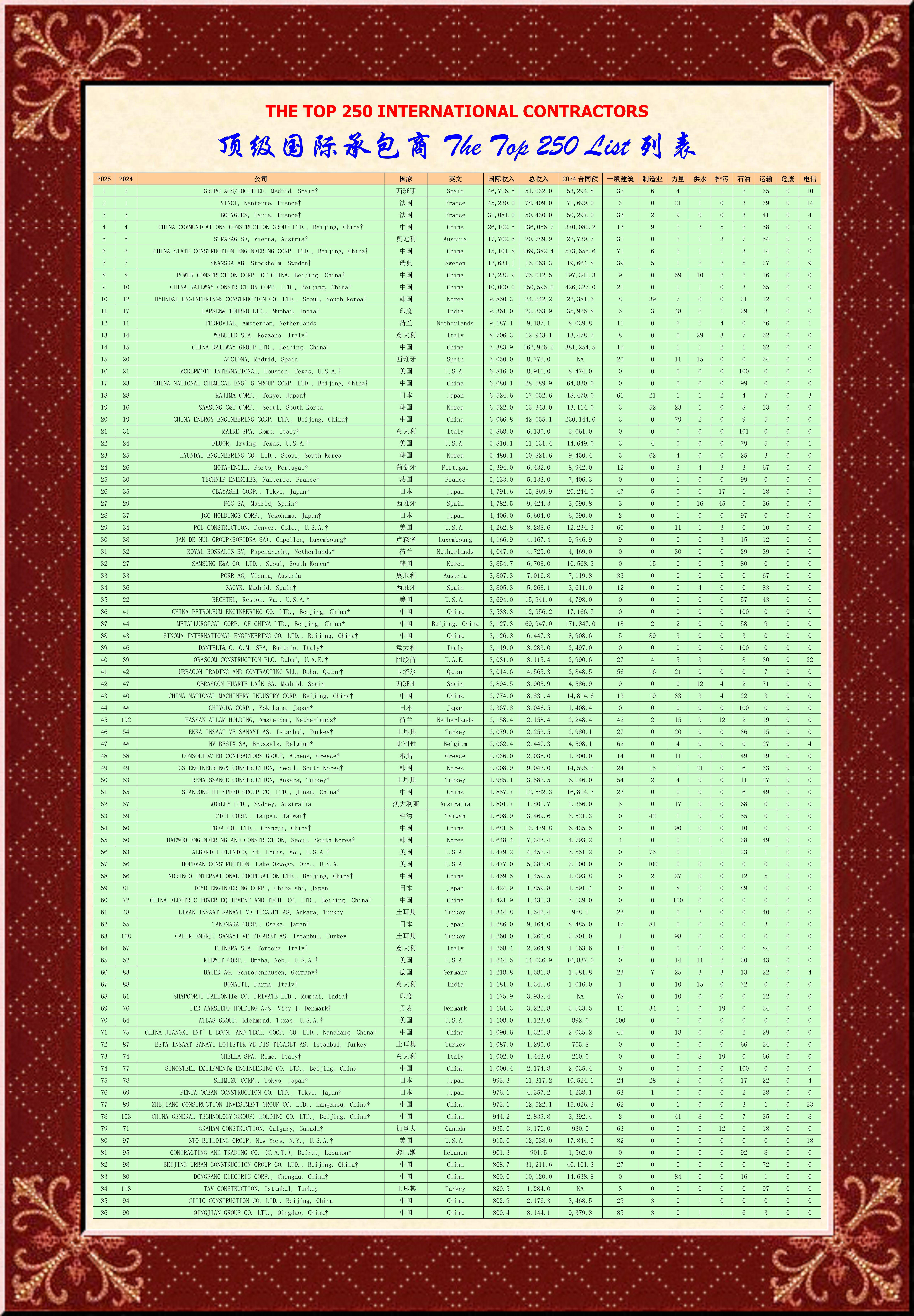 序號(hào) 2025 2024 國(guó)家 公司 國(guó)際收入 總收入 2024合同額 一般建筑 制造業(yè) 力量 供水 排污 石油 運(yùn)輸 危廢 電信