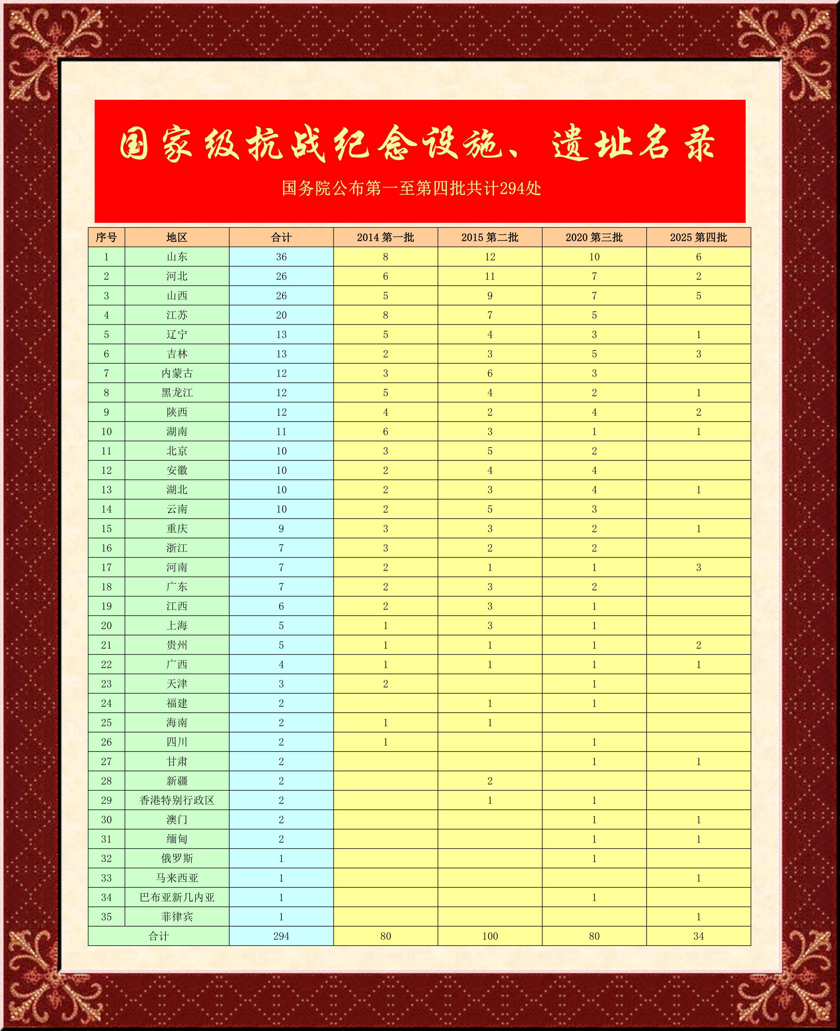 國(guó)務(wù)院關(guān)于公布第四批國(guó)家級(jí)抗戰(zhàn)紀(jì)念設(shè)施、遺址名錄的通知 發(fā)文字號(hào): 國(guó)發(fā)〔2025〕12號(hào) 發(fā)布日期: 2025年08月29日