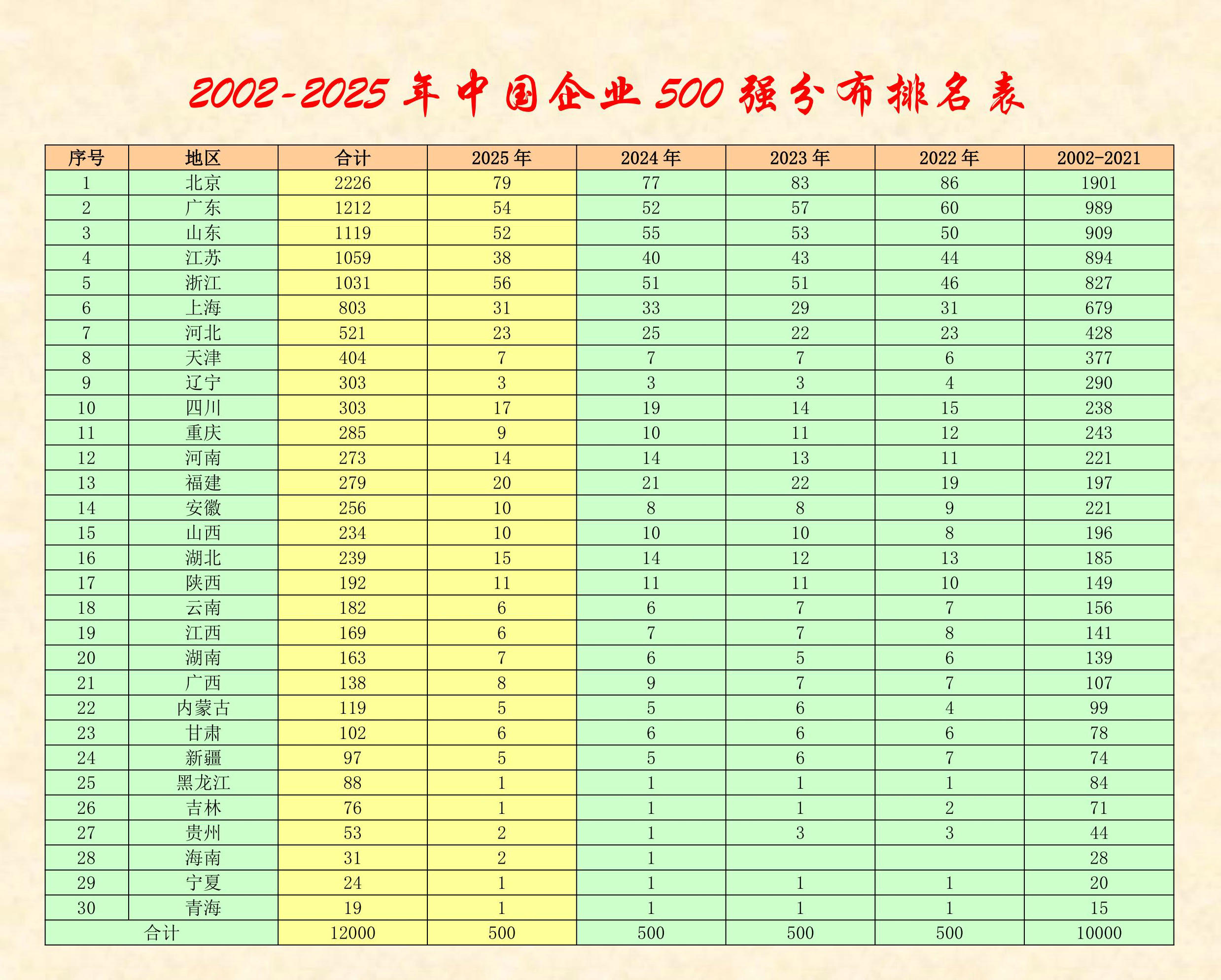 2025中國企業(yè)500強共分布在30個省(自治區(qū)、直轄市)中,分布最多的五個地區(qū)依次是北京、浙江、廣東、山東和江蘇。