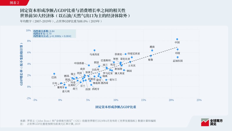 固定資本形成凈額占GDP比重與消費(fèi)增長高度相關(guān),且經(jīng)濟(jì)規(guī)模越大相關(guān)性越強(qiáng)