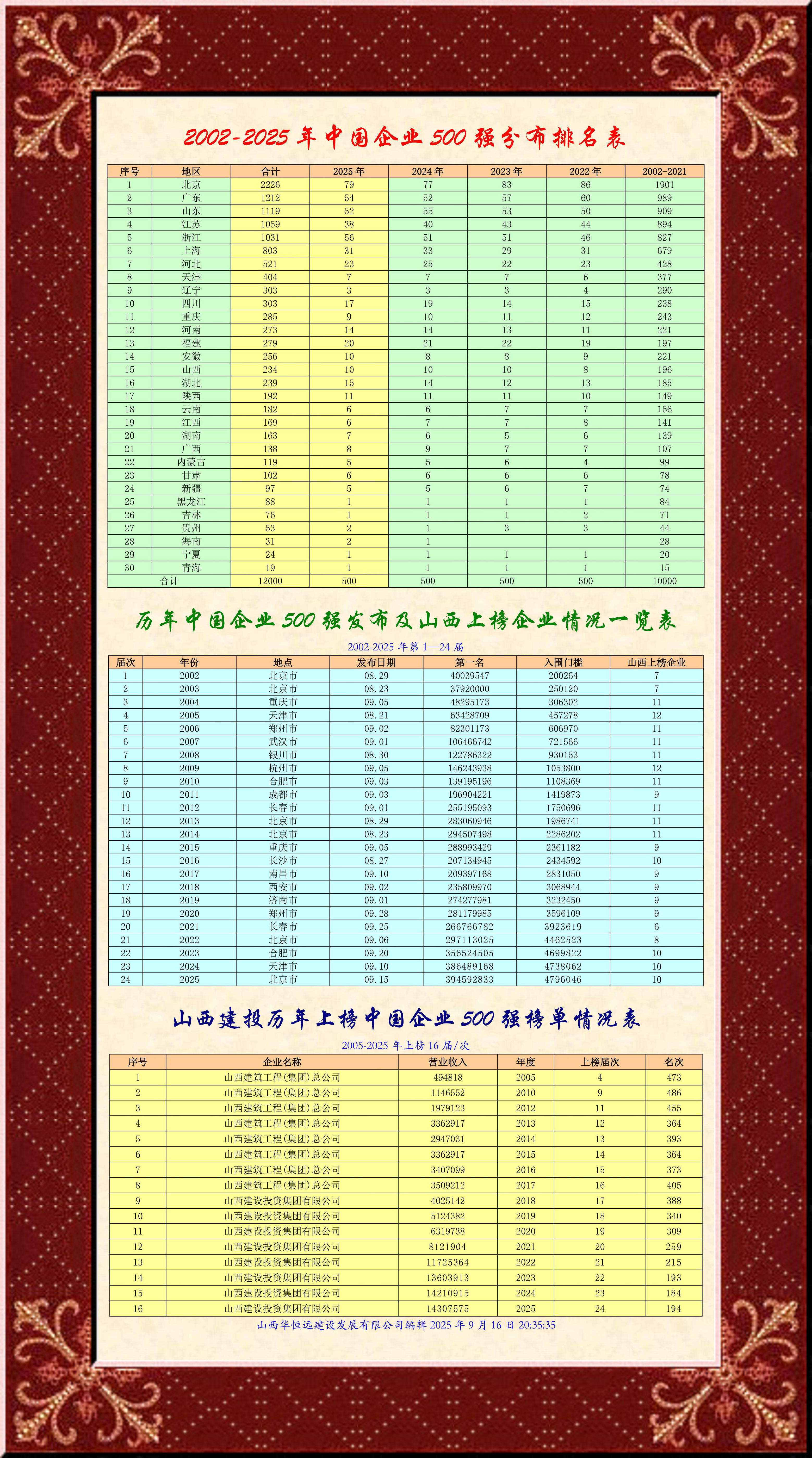 【行業(yè)動(dòng)態(tài)】2025中國(guó)企業(yè)500強(qiáng)發(fā)布?。ǜ桨駟危?/a>2025-09-15