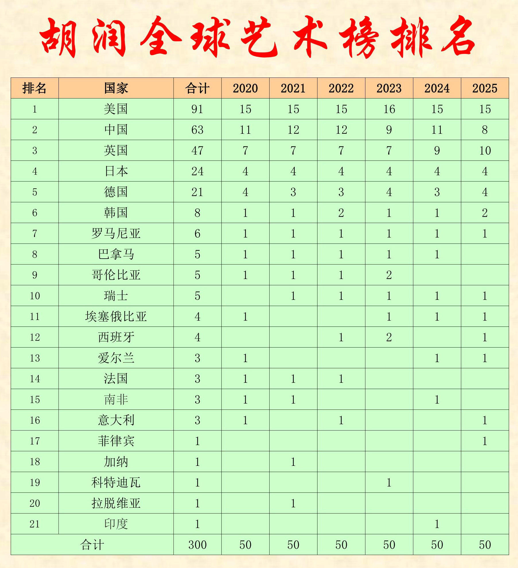 胡潤研究院今日發(fā)布《2025胡潤全球藝術榜》(Hurun Global Art List 2025),榜單內容為前50名全球在世藝術家按照2024年度公開拍賣市場作品總成交額的排名。這是胡潤研究院連續(xù)第六年發(fā)布“全球藝術榜”。