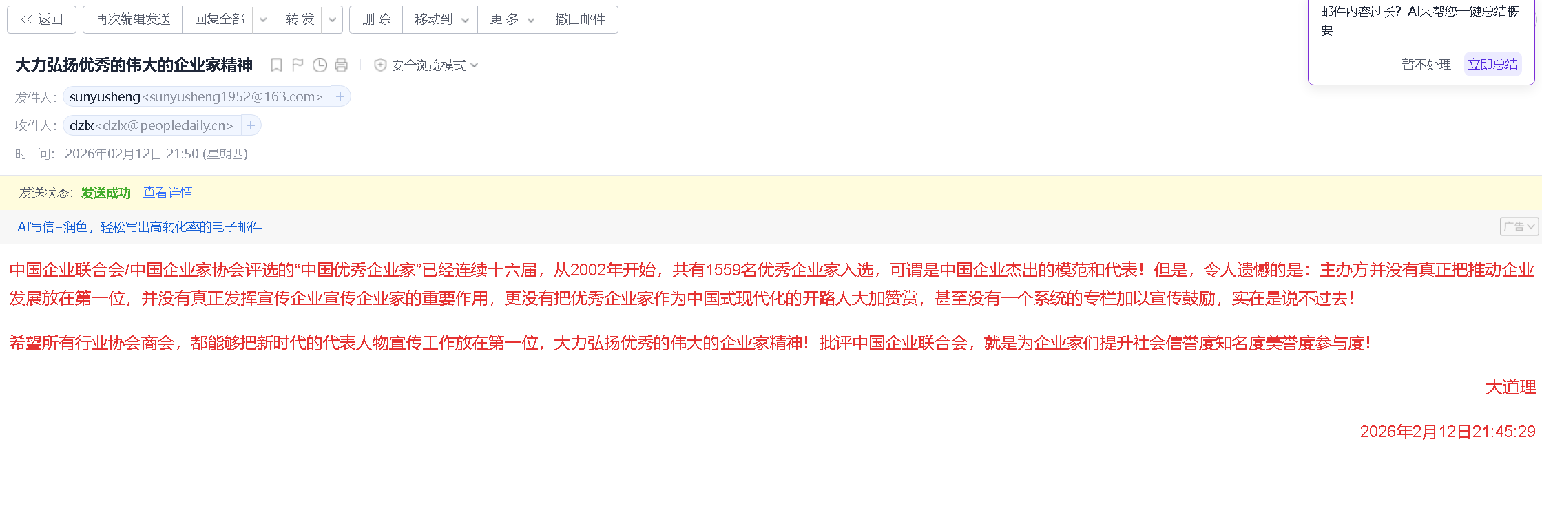 希望所有行業(yè)協(xié)會(huì)商會(huì),都能夠把新時(shí)代的代表人物宣傳工作放在第一位,大力弘揚(yáng)優(yōu)秀的偉大的企業(yè)家精神!批評(píng)中國(guó)企業(yè)聯(lián)合會(huì),就是為企業(yè)家們提升社會(huì)信譽(yù)度知名度美譽(yù)度參與度!