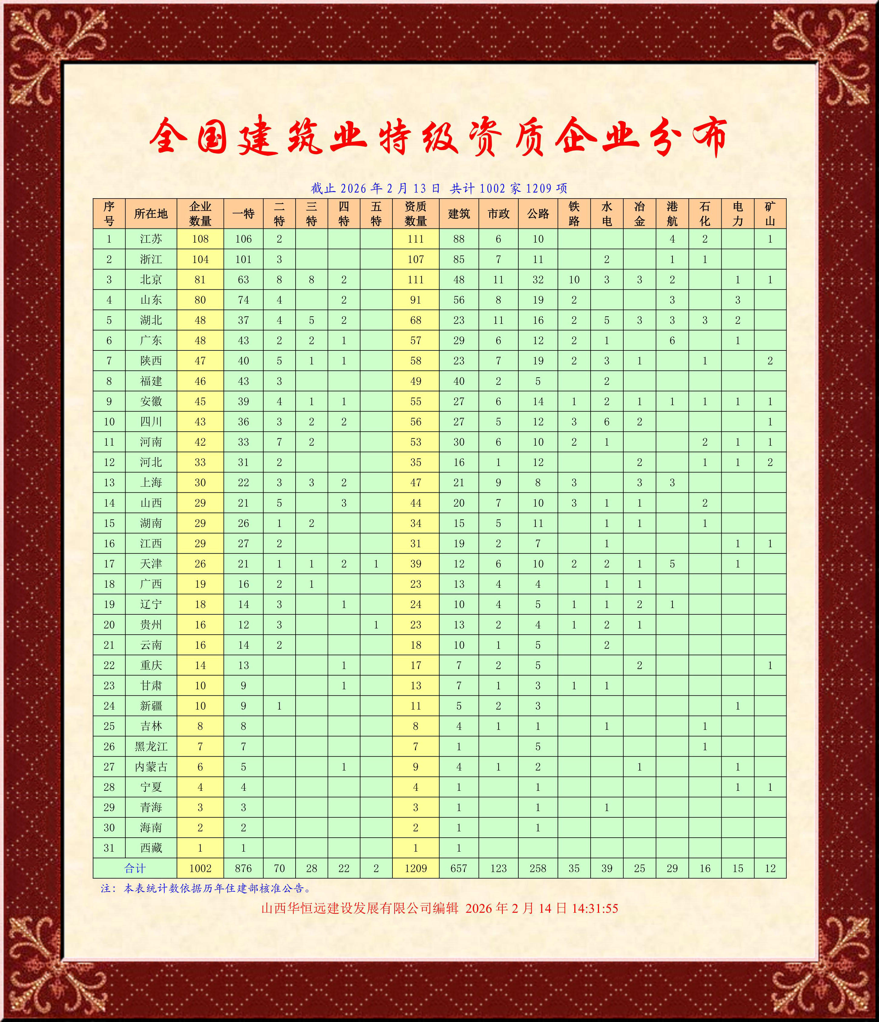 2026年春節(jié)前夕,住建部不失時機(jī)公布今年第二批核準(zhǔn)建設(shè)工程企業(yè)資質(zhì)名單公告,其中核準(zhǔn)7家特級企業(yè)晉升增項,至此全國建筑業(yè)特級企業(yè)跨越了一千家!